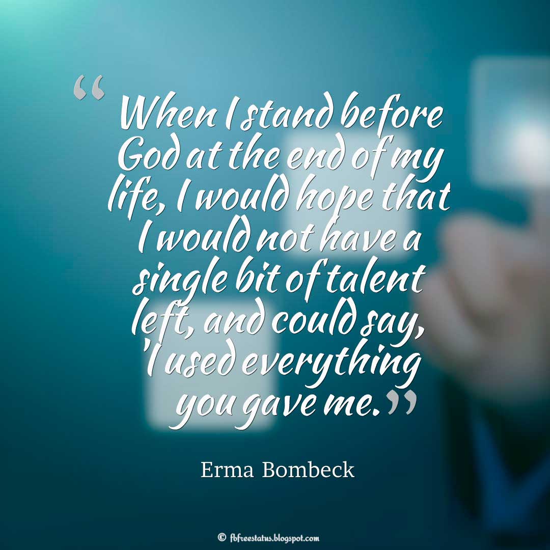 When I stand before God at the end of my life, I would hope that I would not have a single bit of talent left, and could say, 'I used everything you gave me'.? Erma Bombeck